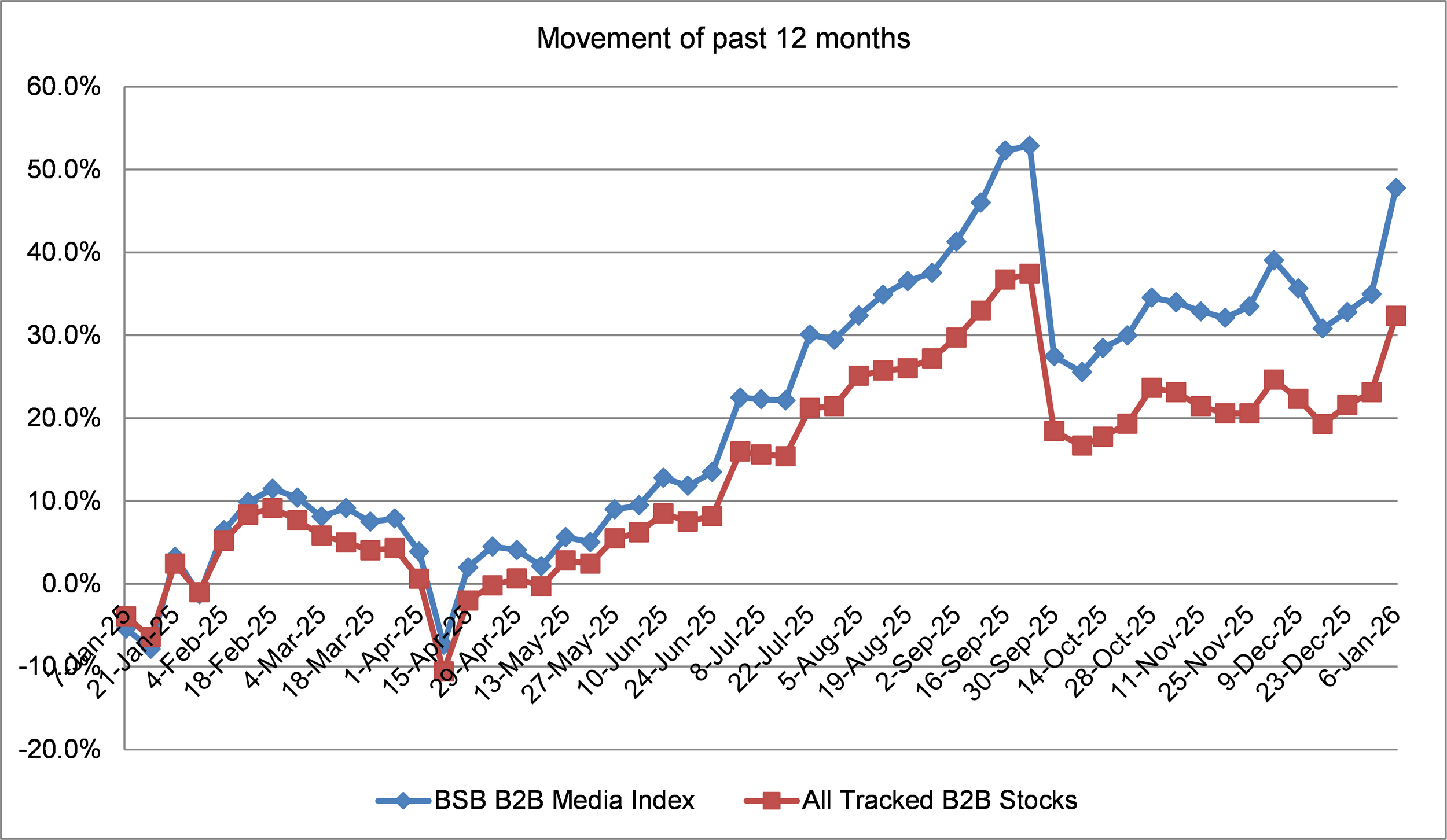 Figure 1: BSG B2B Media Index vs. All Tracked B2B Stocks (price movement over past 12 months)