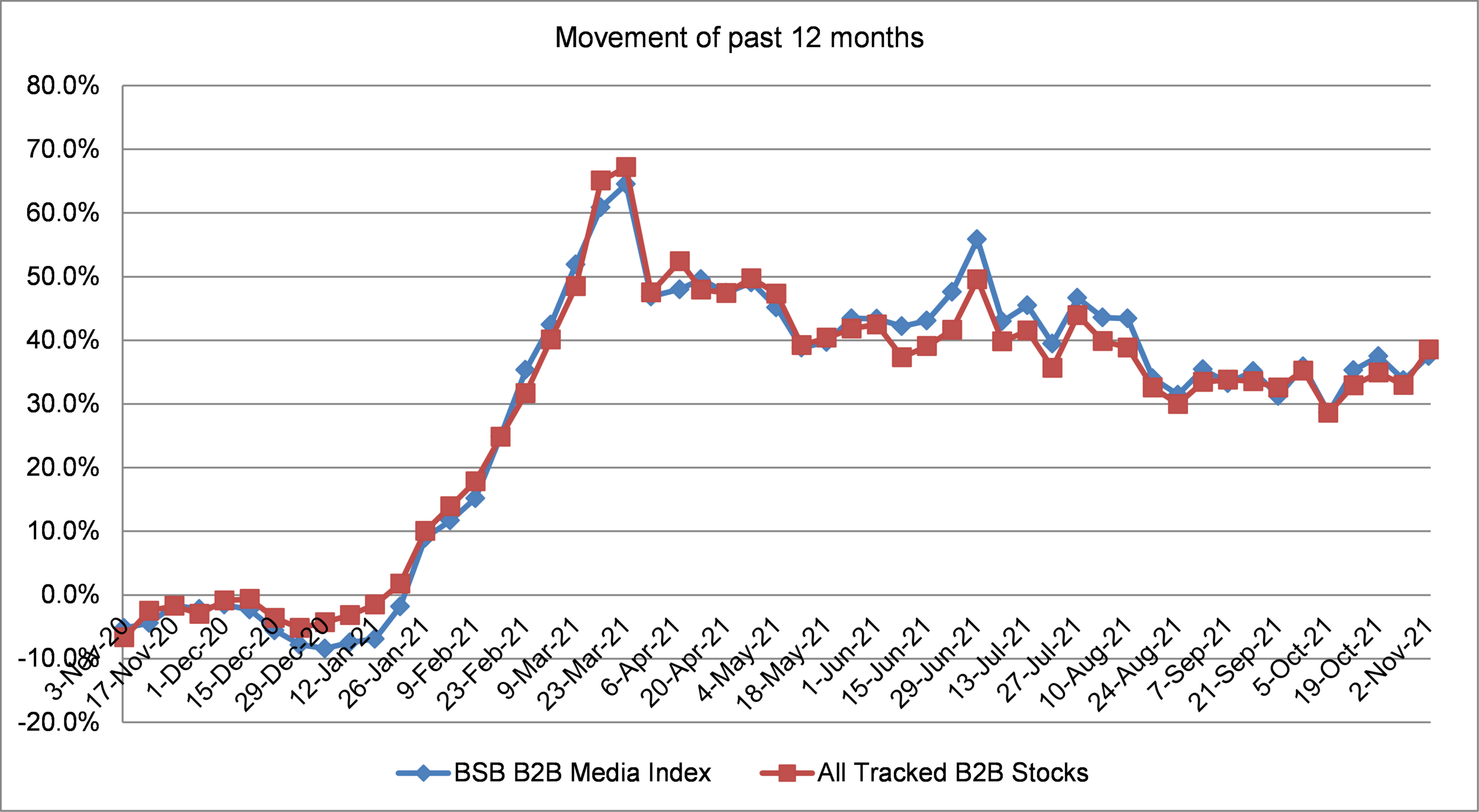 Figure 1: BSG B2B Media Index vs. All Tracked B2B Stocks (price movement over past 12 months)