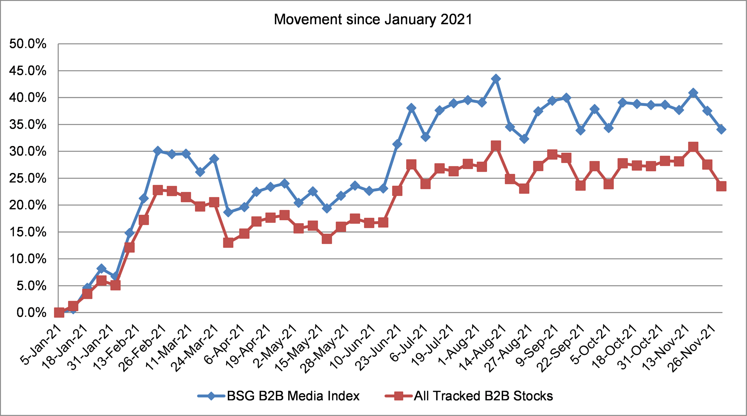 Figure 2: BSG B2B Media Index vs. All Tracked B2B Stocks (price movement since January 2021)