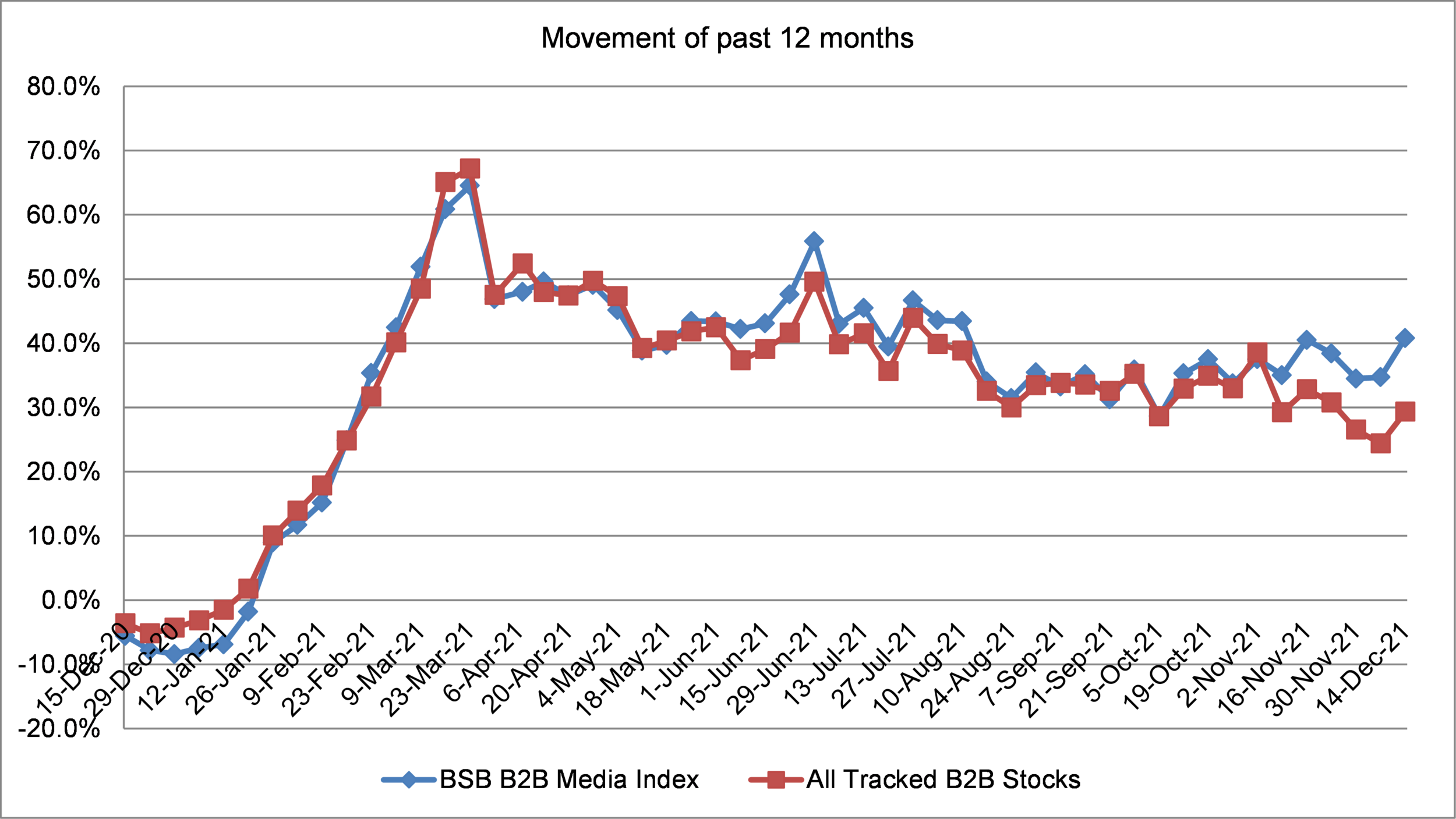 /Figure 1: BSG B2B Media Index vs. All Tracked B2B Stocks (price movement over past 12 months)
